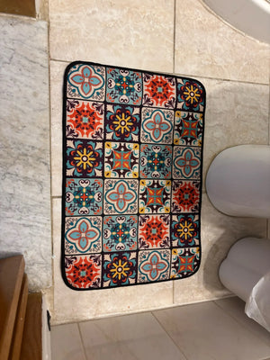 The rug features a nonslip backing that grips the floor securely, reducing the risk of slips and falls even on wet surfaces.