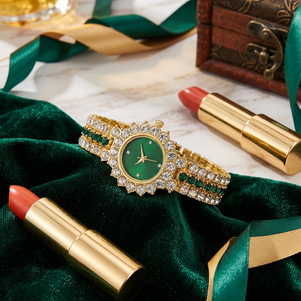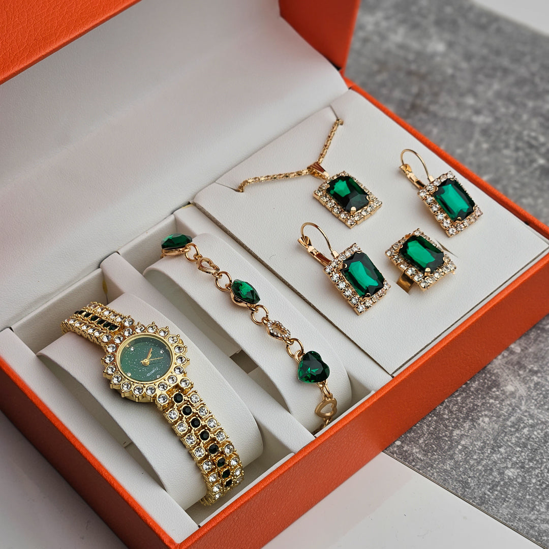 A készlet tartalmaz egy órát, nyakláncot, karkötőt, fülbevalót és egy állítható gyűrűt, mind aranyszínű, zöld cirkónia kövekkel díszítve. Az ékszerek könnyűek, kényelmesek, és különösebb erőfeszítés nélkül összeillenek.